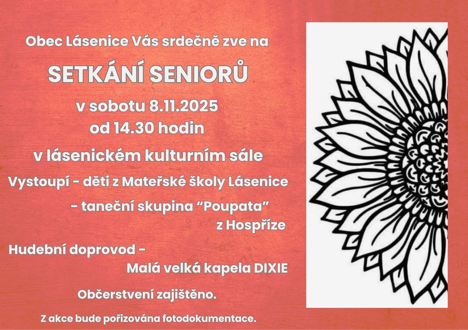 Obec Lásenice srdečně zve všechny lásenické seniory na tradiční setkání, které se uskuteční v sobotu 8.11.2025.